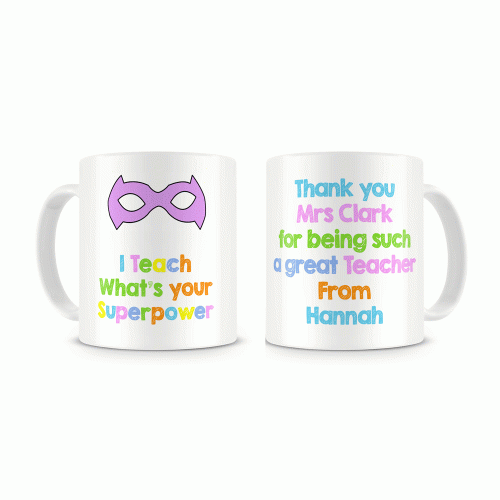 A personalised version of our "I Teach .... Whats your Superpower" with a message on the back to thank your teacher, with the teachers name and also your childs name. Available in two different masks.